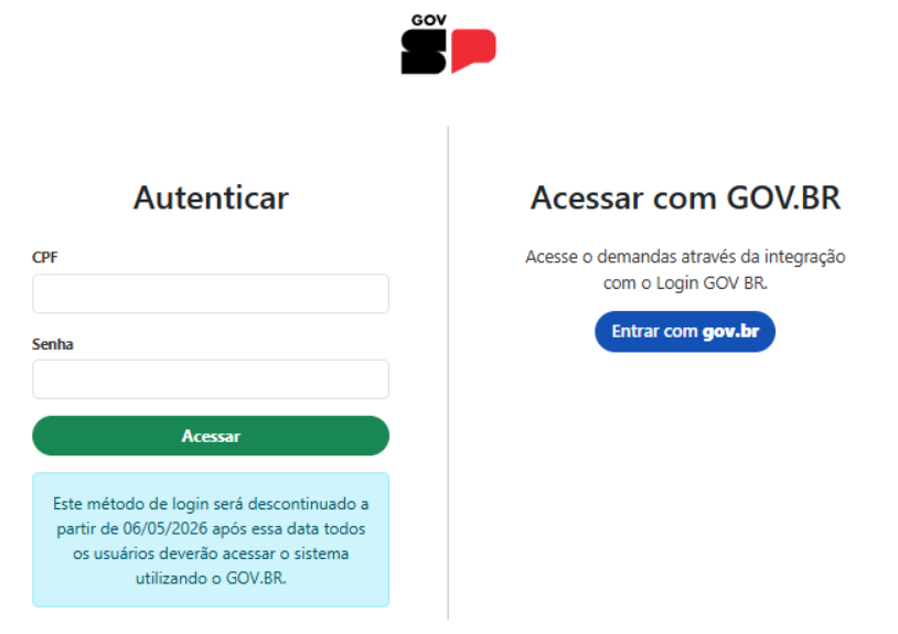 O sistema permitirá o acesso através de CPF e Senha (atualmente utilizada para se autenticar no Portal Sem Papel e dentro do sistema para tramitações, anexos de documentos, assinatura de documentos etc.) até a data informada na página no momento da Autenticação. Durante este período, o sistema também permitirá o acesso através das credenciais utilizadas para acessar o GOV BR.